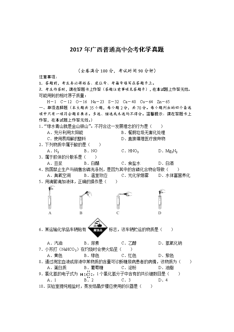 【文档名称】 2017年广西普通高中会考化学真题及答案(Word版).doc