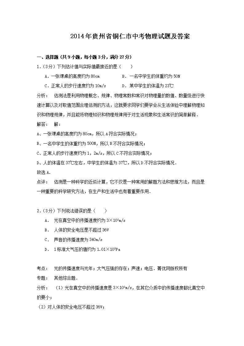【文档预览】 无忧考网整理发布2014年贵州省铜仁市中考物理试题及答案(Word版),前五页预览如下: