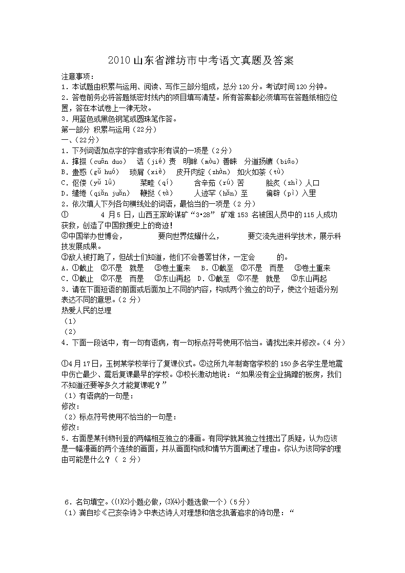 【文档名称】 2010山东省潍坊市中考语文真题及答案(Word版).doc