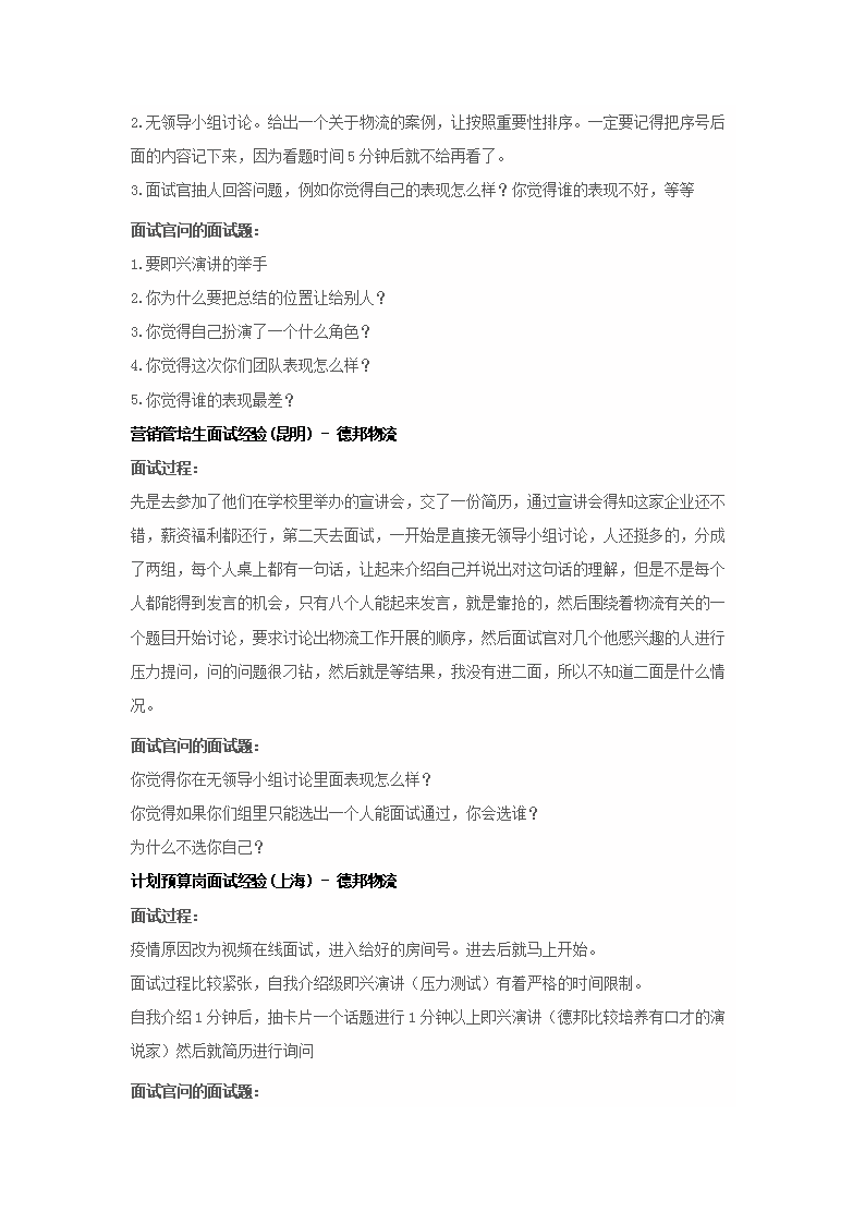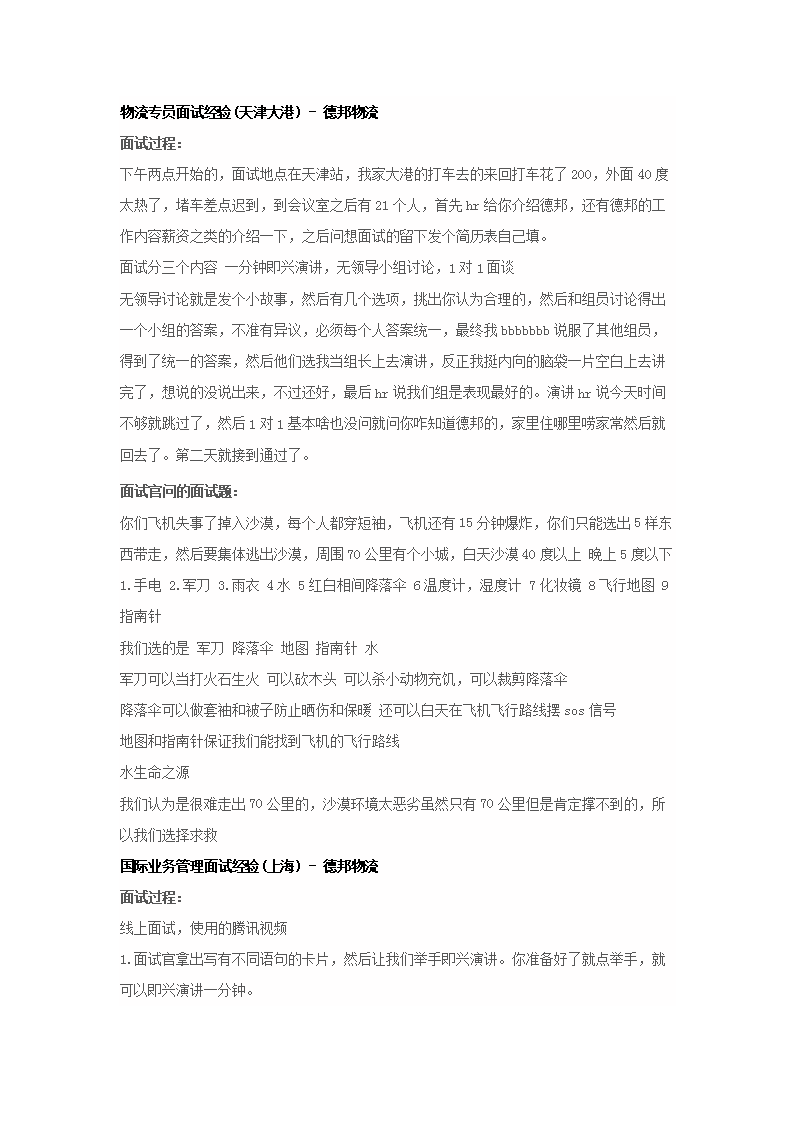 【文档名称】 德邦物流招聘面试试题及过程(Word版).doc