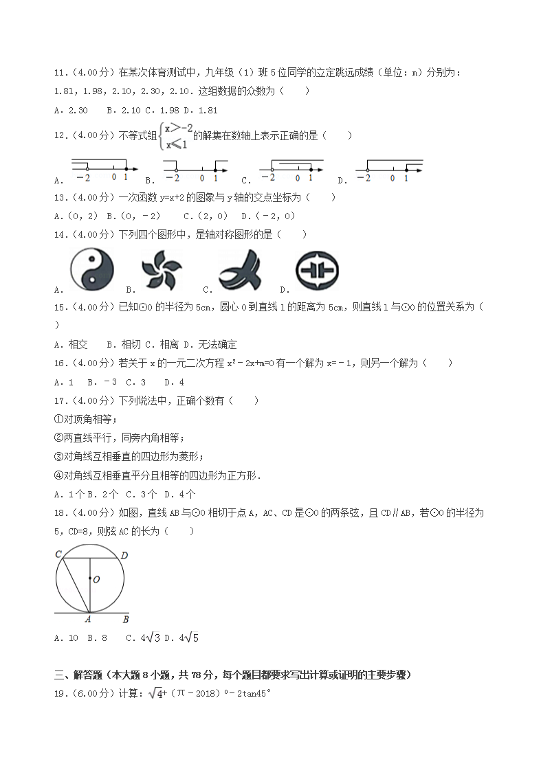 【文档名称】 2018年湖南省湘西州中考数学真题及答案(Word版).doc