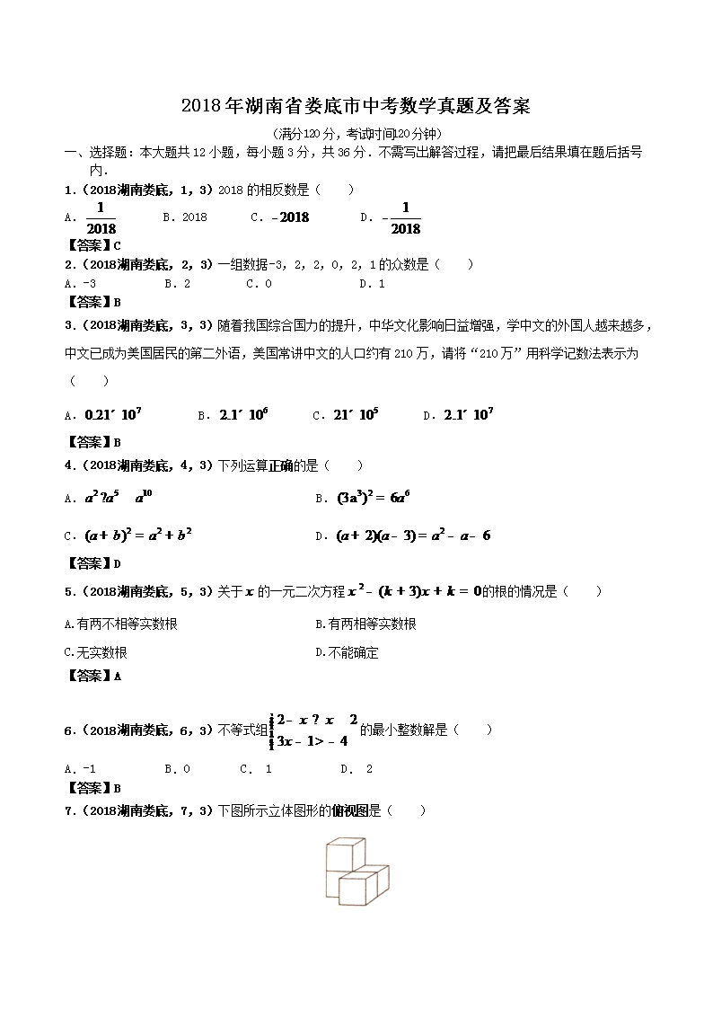【文档名称】 2018年湖南省娄底市中考数学真题及答案(Word版).doc
