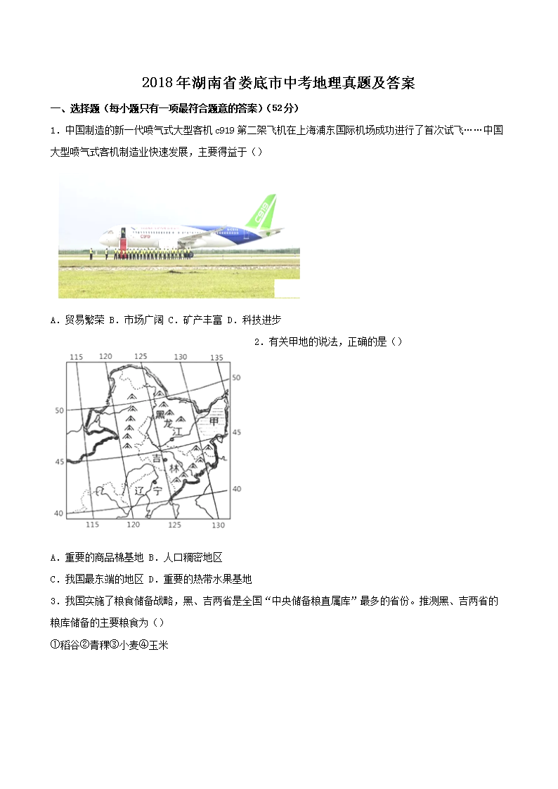 【文档名称】 2018年湖南省娄底市中考地理真题及答案(Word版).doc