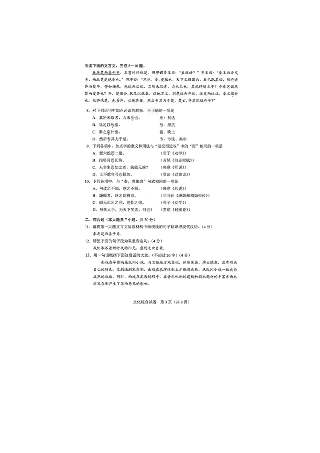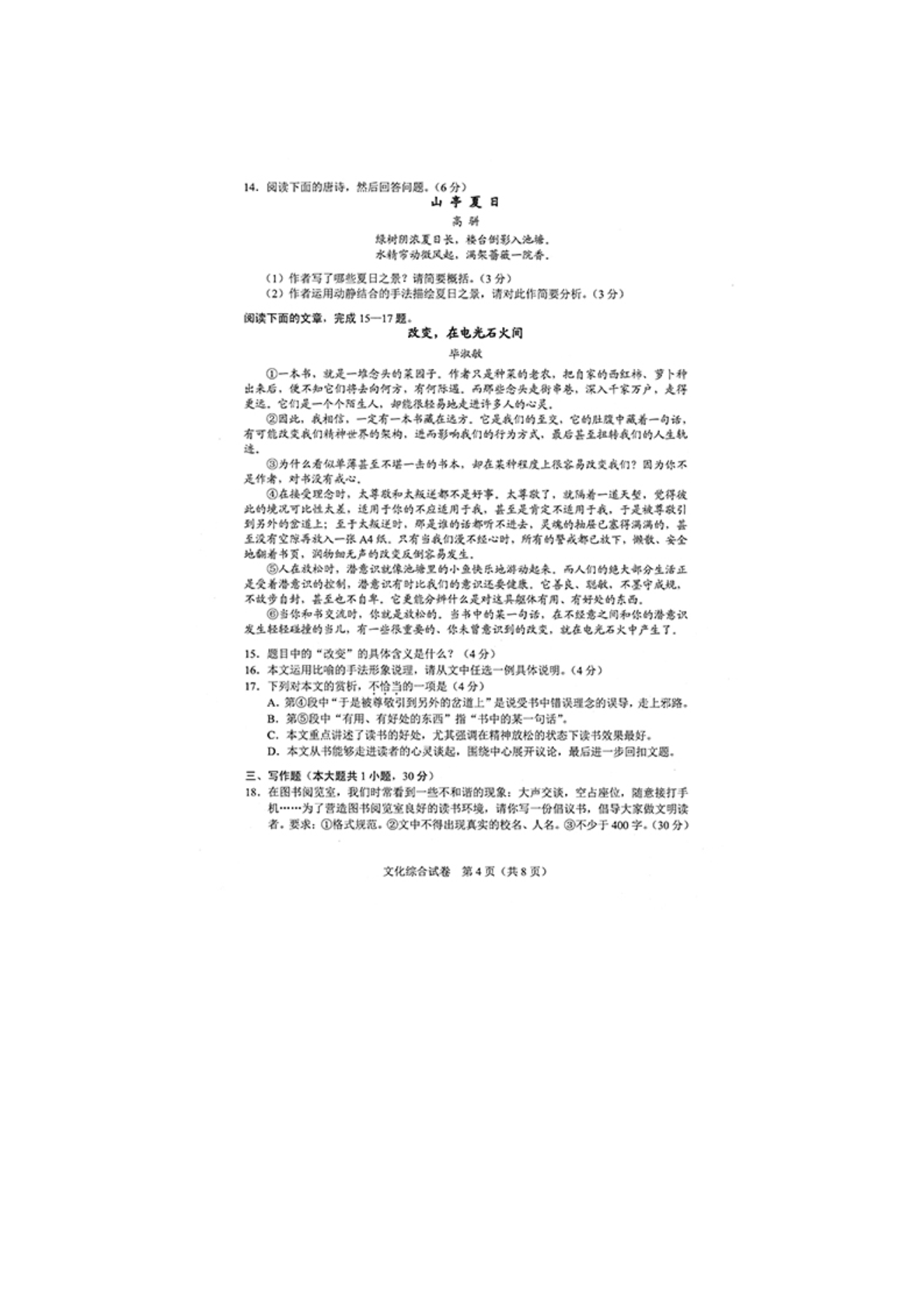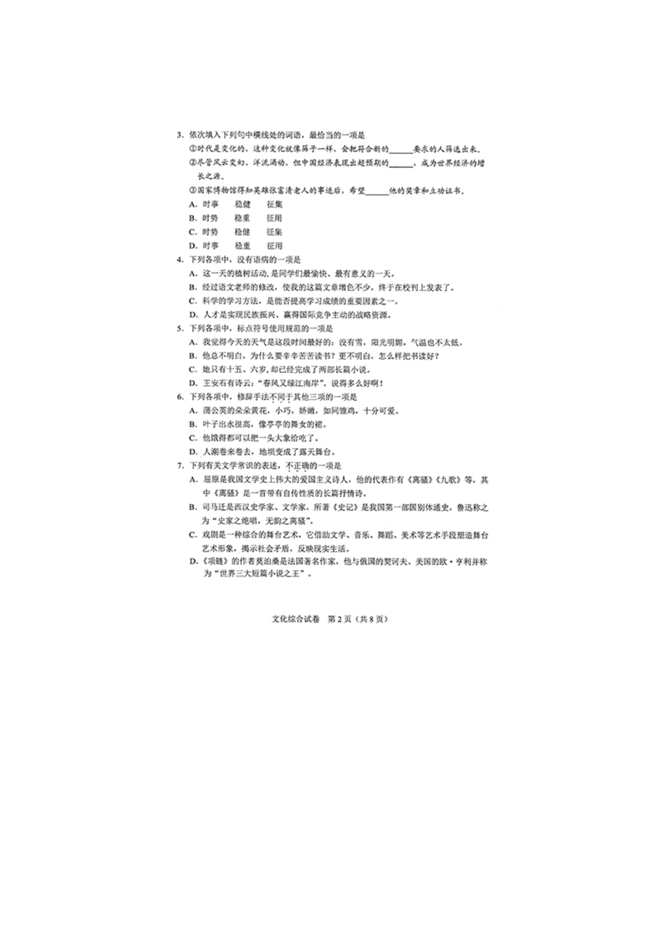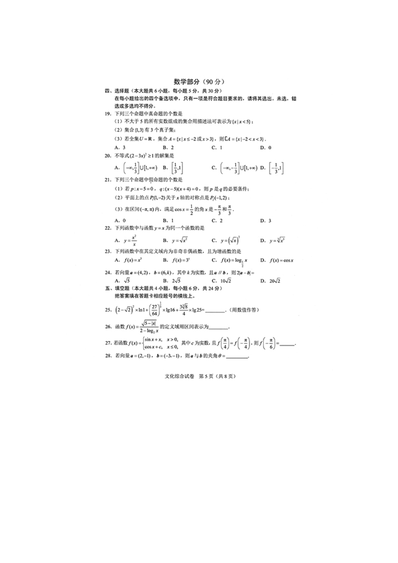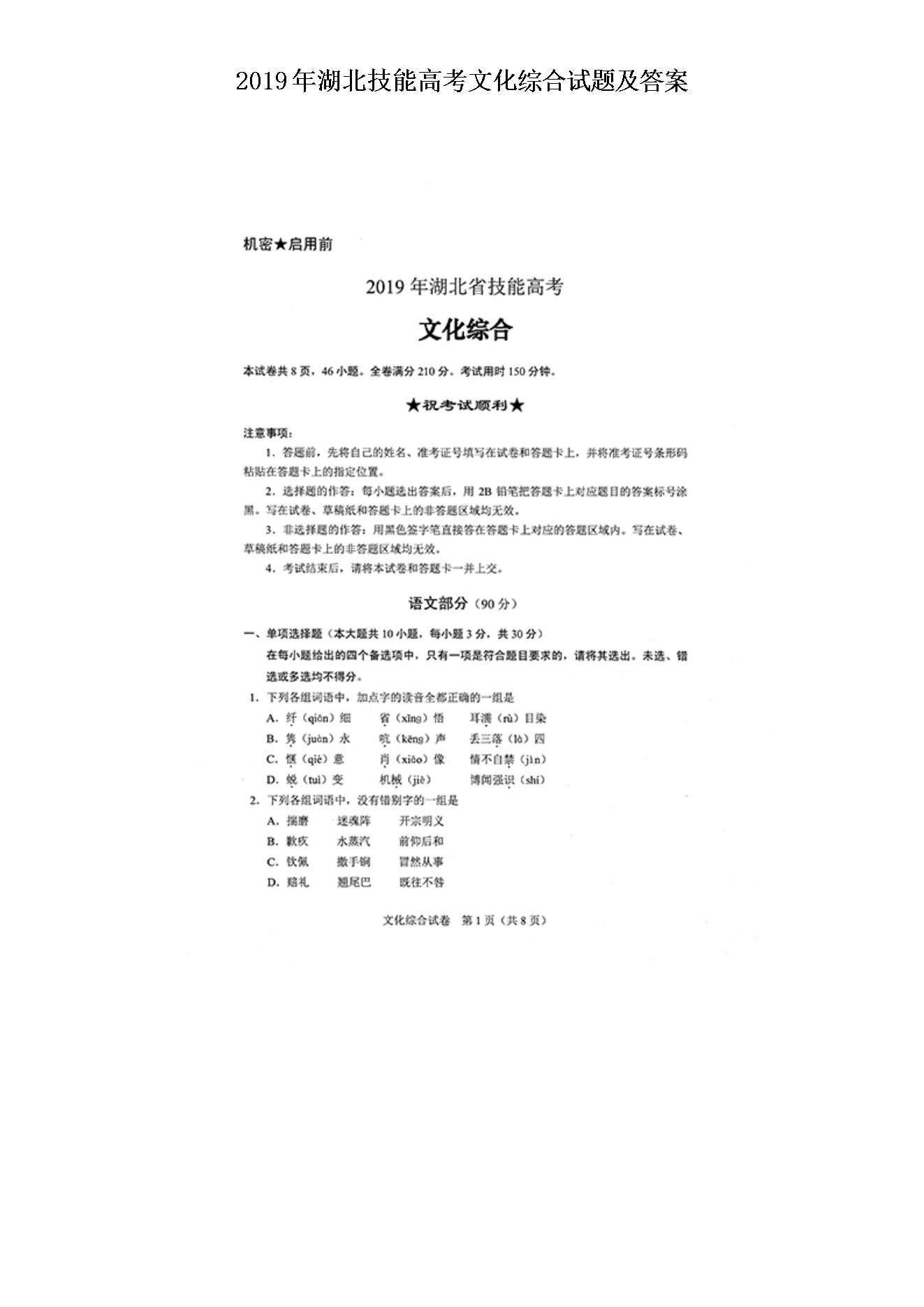 【文档名称】 2019年湖北技能高考文化综合试题及答案(图片版).doc