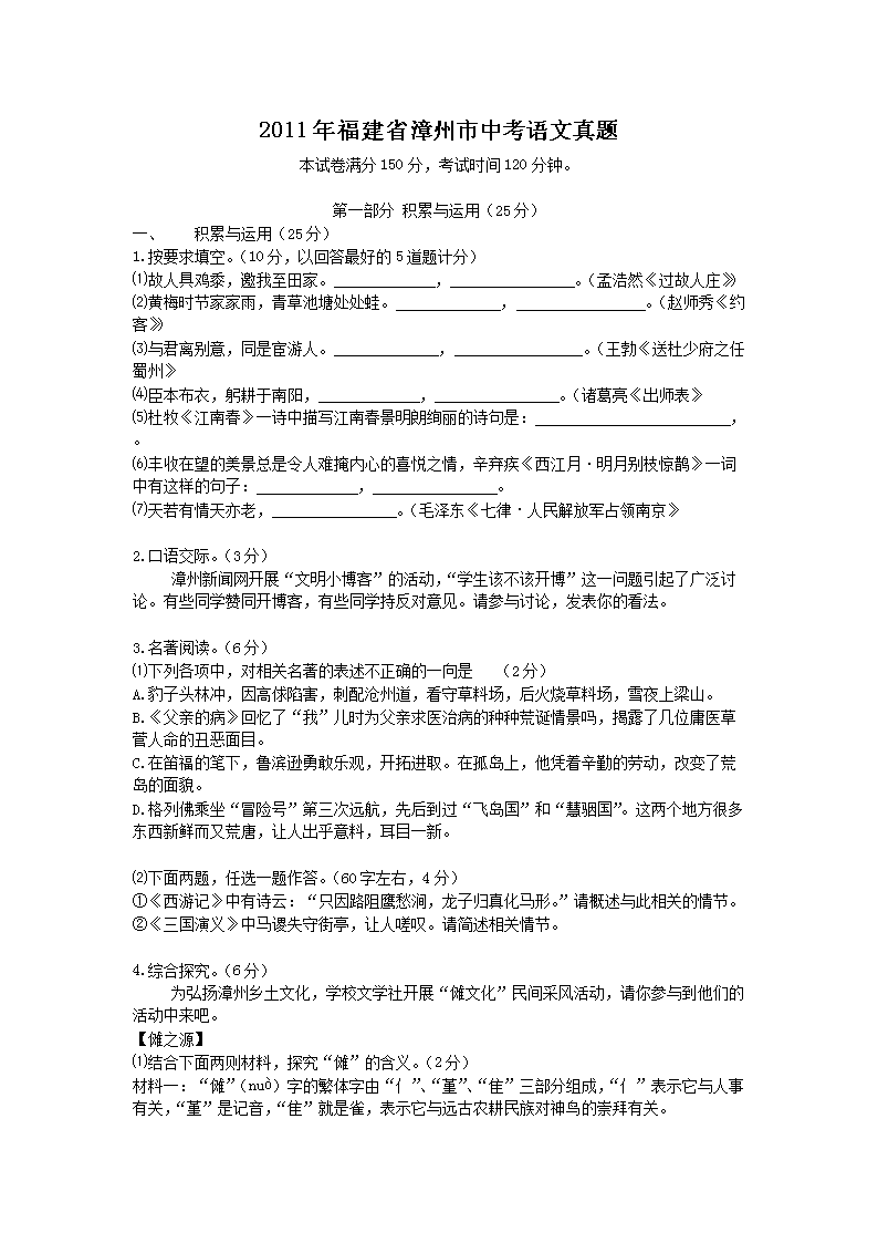 【文档名称】 2011年福建省漳州市中考语文真题(Word版).doc