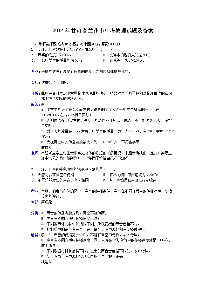 【文档名称】 2014年甘肃省兰州市中考物理试题及答案(Word版).doc