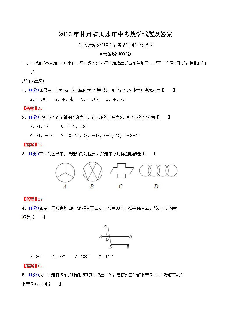 【文档预览】 无忧考网整理发布2012年甘肃省天水市中考数学试题及答案(Word版),前五页预览如下: