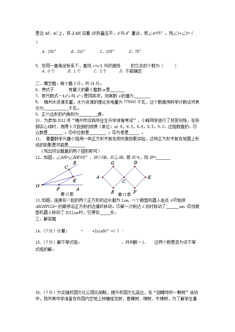 【文档名称】 2012年广东省梅州市中考数学试题及答案(Word版).doc