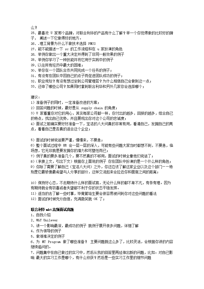 【文档预览】 无忧考网整理发布联合利华中英文面试试题汇总(Word版),前五页预览如下: