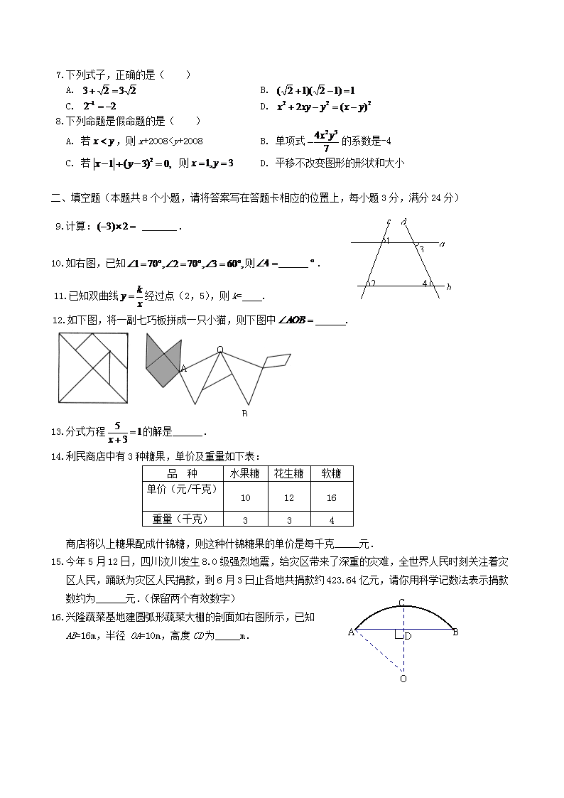 【文档名称】 2008年湖南省湘潭市中考数学真题及答案(Word版).doc