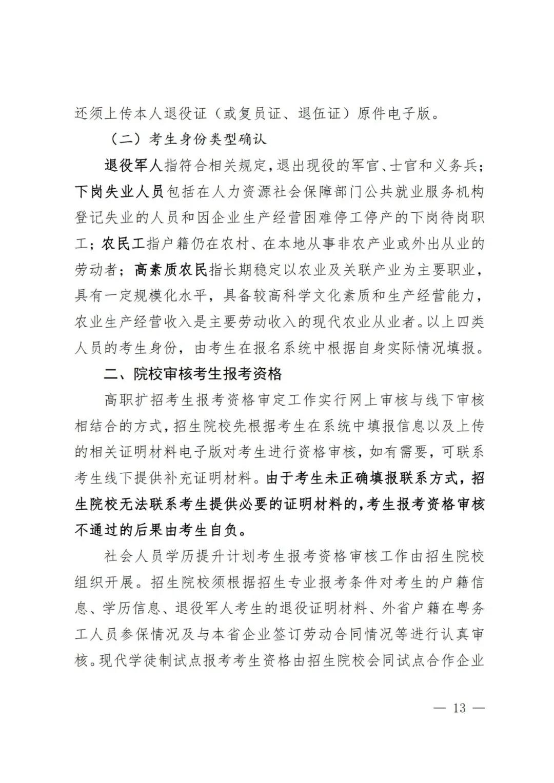 符合高职扩招专项行动相关院校专业报考条件且拟报考2020年高职扩招专项行动的考生须进行广东省2020年高职扩招报名及院校专业志愿填报。已参加2020年普通高校招生统一报名且获得高考报名号的考生可直接进行院校专业志愿填报。高职扩招报名、院校专业志愿填报、考生报考资格审核及复核工作流程详见附件1。