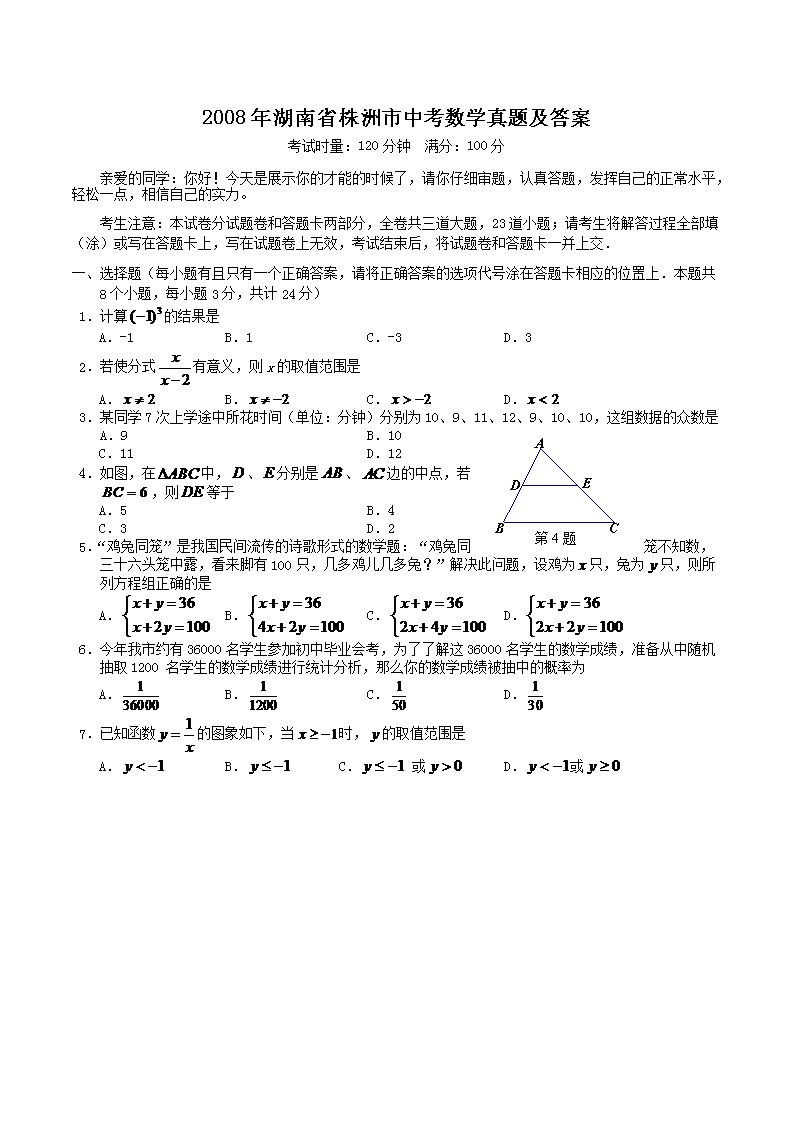 【文档预览】 无忧考网整理发布2008年湖南省株洲市中考数学真题及答案(Word版),前五页预览如下: