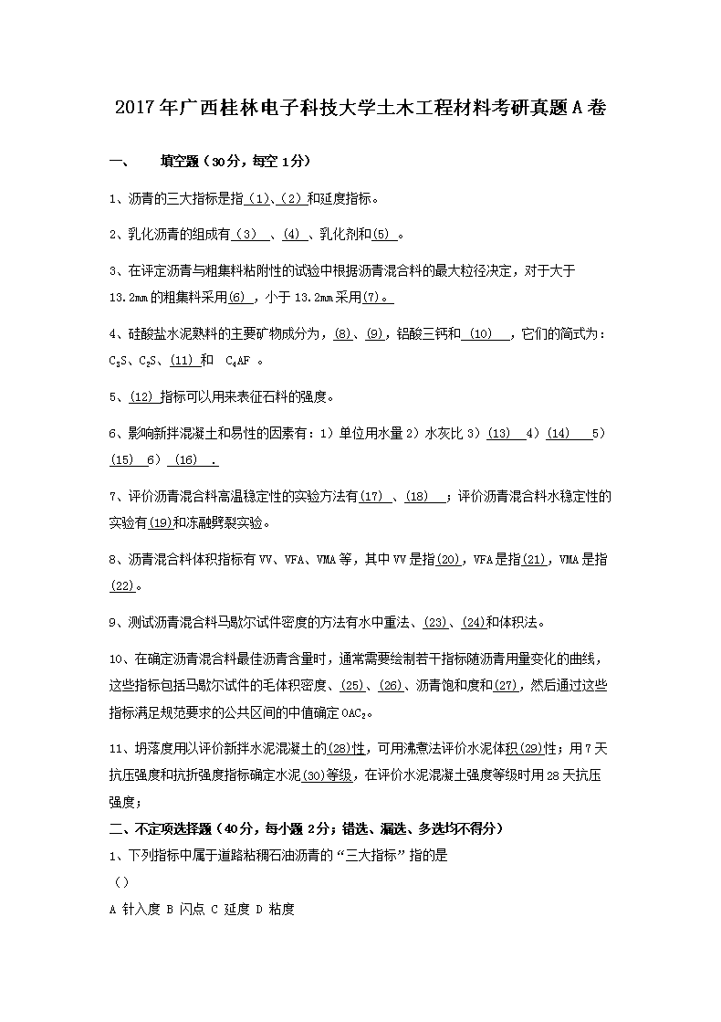 【文档名称】 2017年广西桂林电子科技大学土木工程材料考研真题A卷(Word版).doc