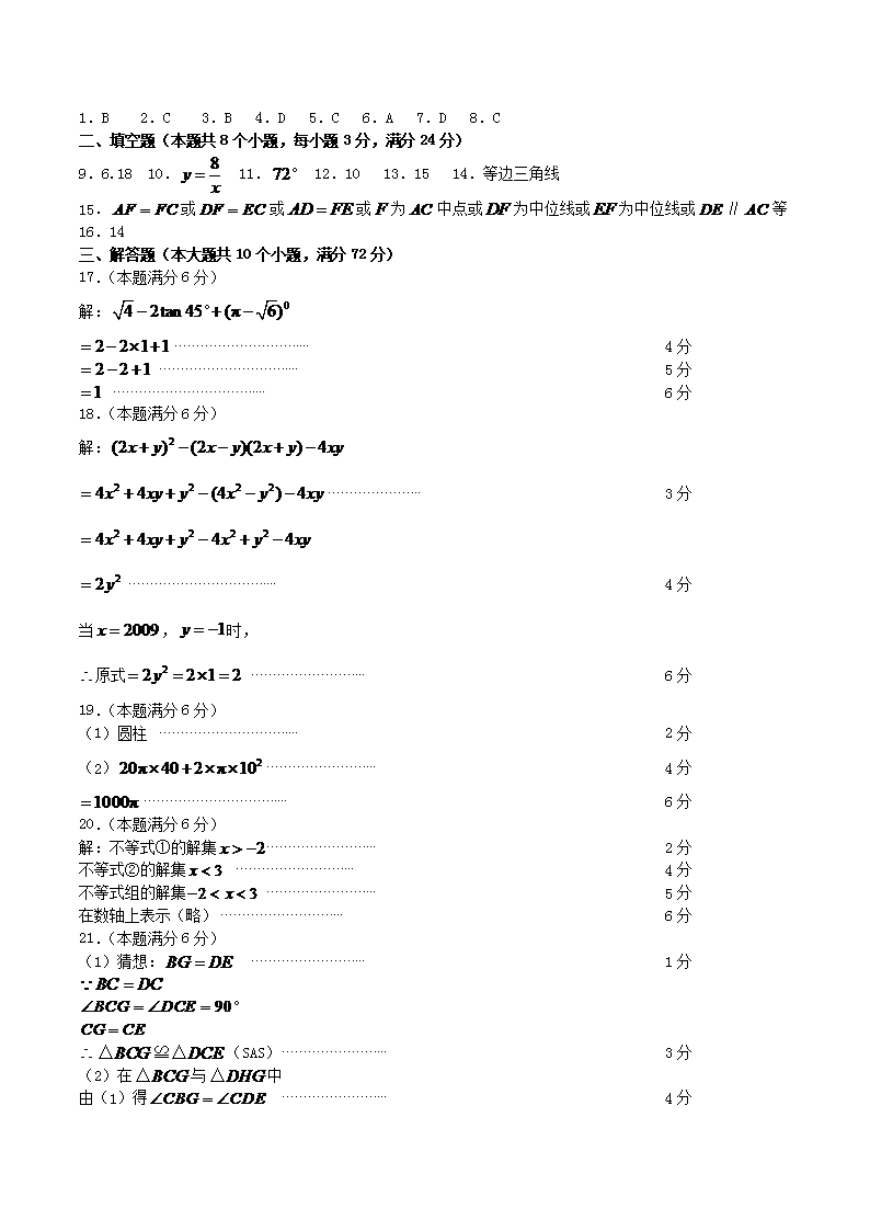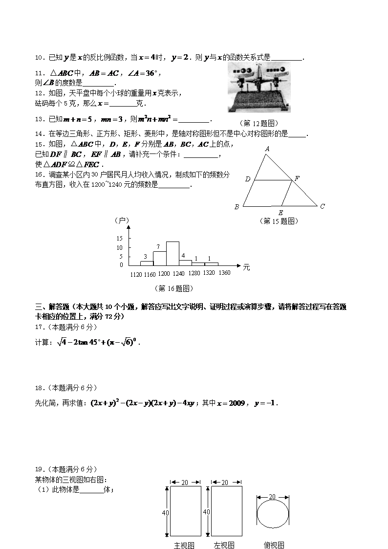 【文档名称】 2009年湖南省湘潭市中考数学真题及答案(Word版).doc