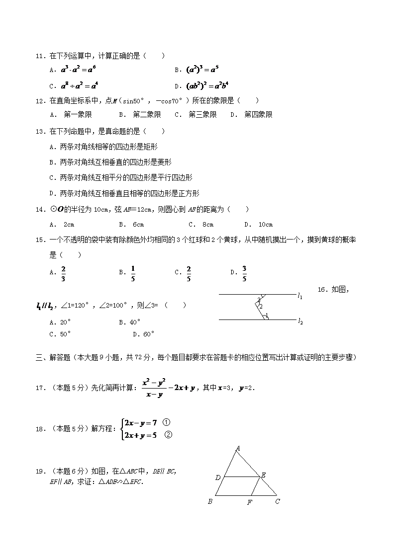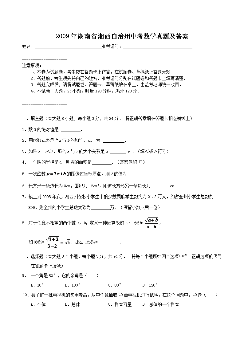 【文档名称】 2009年湖南省湘西自治州中考数学真题及答案(Word版).doc