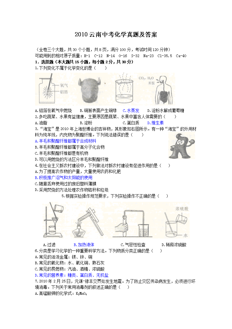 【文档预览】 无忧考网整理发布2010云南中考化学真题及答案(Word版),前五页预览如下:
