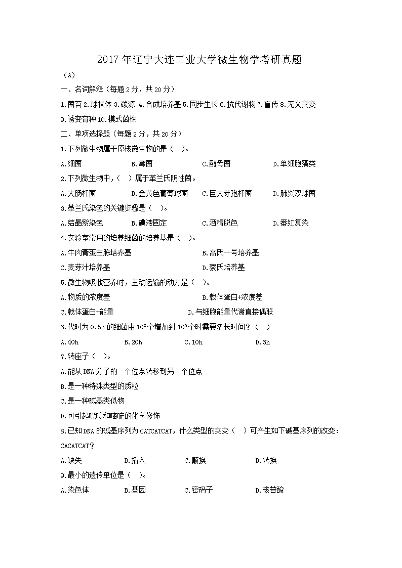 【文档名称】 2017年辽宁大连工业大学微生物学考研真题(Word版).doc