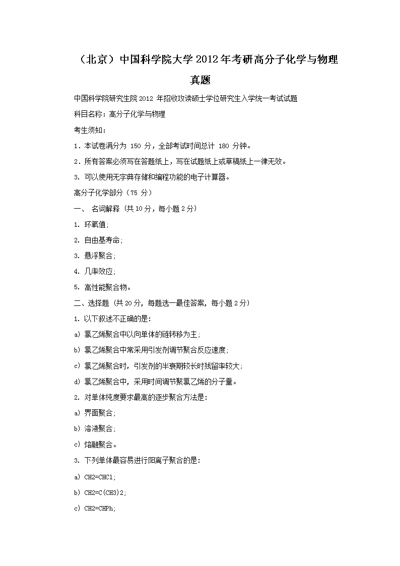 【文档预览】 无忧考网整理发布(北京)中国科学院大学2012年考研高分子化学与物理真题(Word版),前五页预览如下: