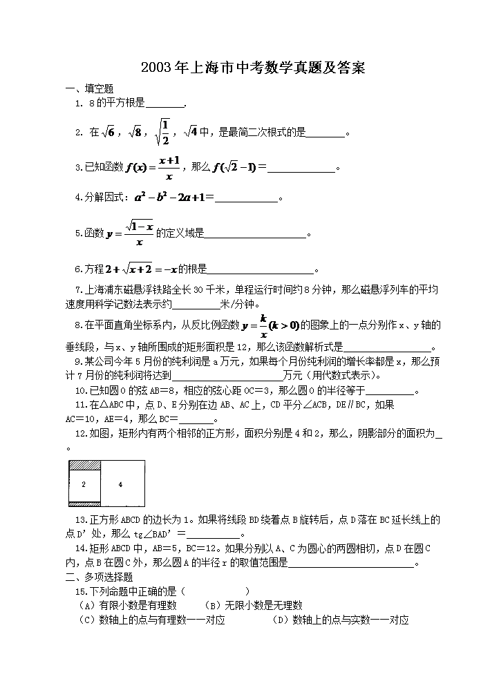 【文档名称】 2003年上海市中考数学真题及答案(Word版).doc