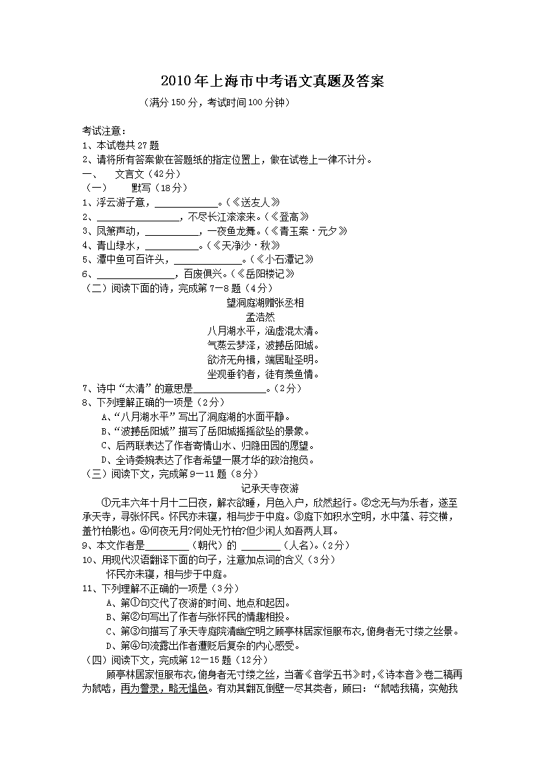 【文档名称】 2010年上海市中考语文真题及答案(Word版).doc
