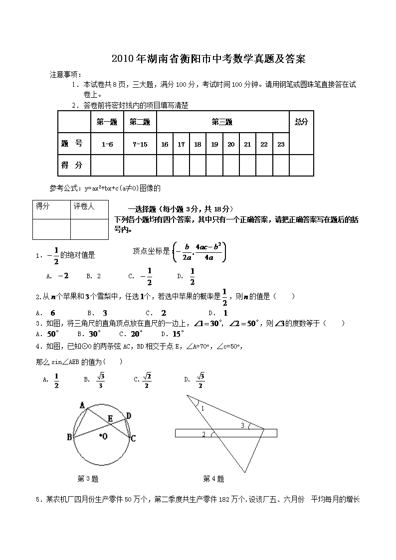 【文档预览】 无忧考网整理发布2010年湖南省衡阳市中考数学真题及答案(Word版),前五页预览如下: