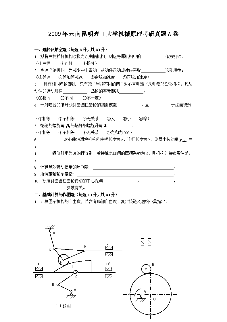 【文档名称】 2009年云南昆明理工大学机械原理考研真题A卷(Word版).doc