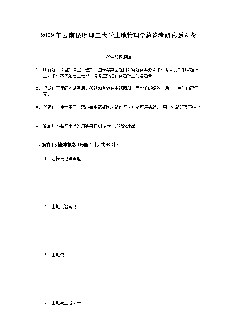 【文档名称】 2009年云南昆明理工大学土地管理学总论考研真题A卷(Word版).doc