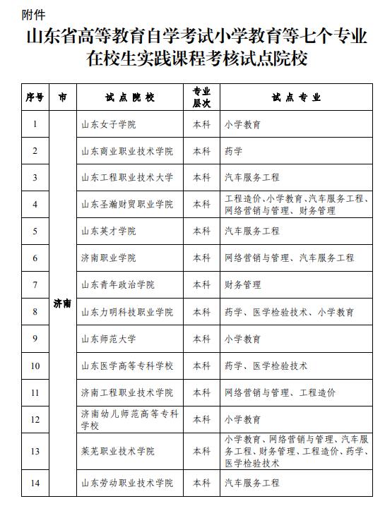 根据《关于新增山东省高等教育自学考试在校生实践课程考核试点专业及考试计划的通知》(鲁招考〔2020〕77号)精神,现将审核通过的小学教育等7个专业在校生实践课程考核试点院校名单予以公布(见附件)。