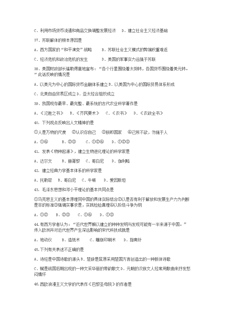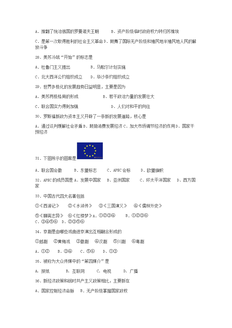 【文档名称】 2012年天津普通高中会考历史真题及答案(Word版).doc