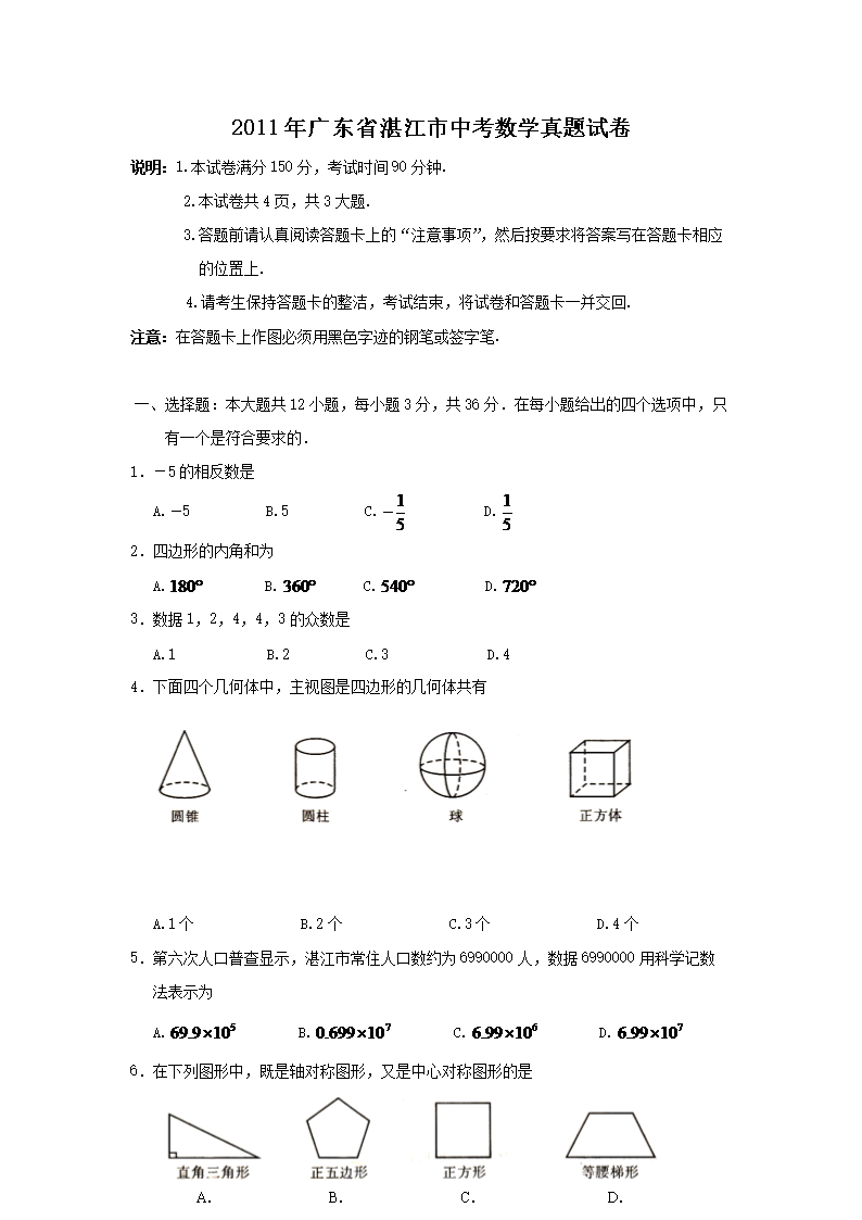 【文档名称】 2011年广东省湛江市中考数学真题试卷(Word版).doc