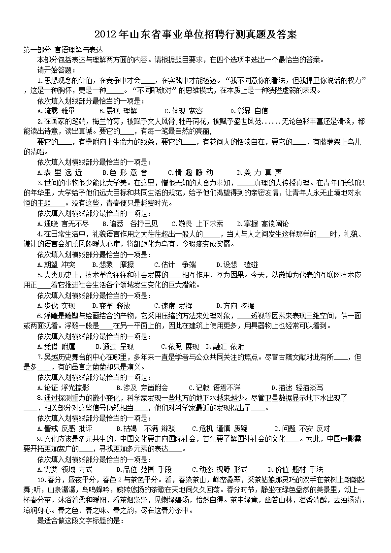 【文档名称】 2012年山东省事业单位招聘行测真题及答案(Word版).doc