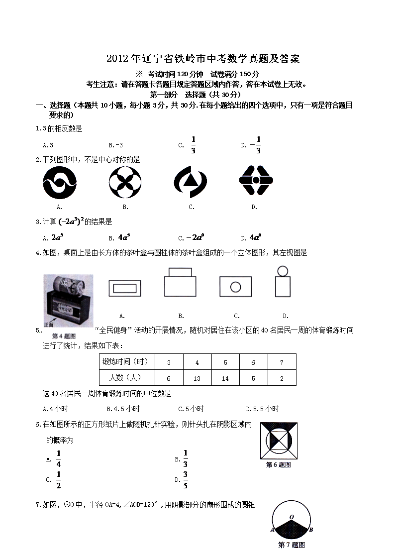 【文档名称】 2012年辽宁省铁岭市中考数学真题及答案(Word版).doc