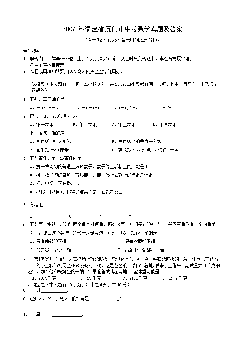 【文档名称】 2007年福建省厦门市中考数学真题及答案(Word版).doc