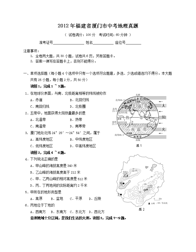 【文档预览】 无忧考网整理发布2012年福建省厦门市中考地理真题(Word版),前五页预览如下: