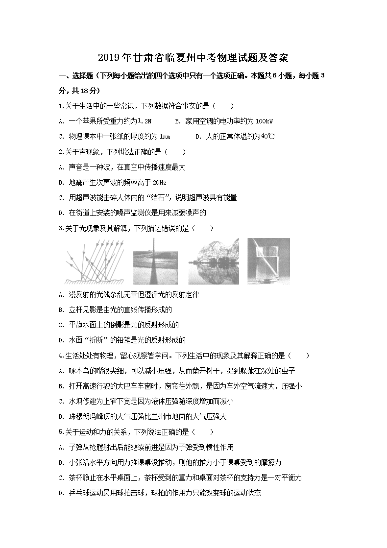 【文档名称】 2019年甘肃省临夏州中考物理试题及答案(Word版).doc