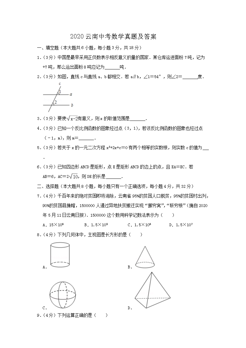 【文档名称】 2020云南中考数学真题及答案(Word版).doc