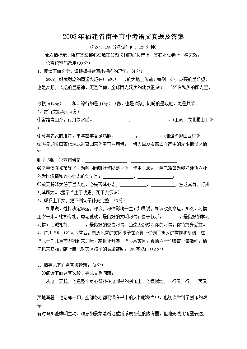 【文档名称】 2008年福建省南平市中考语文真题及答案(Word版).doc