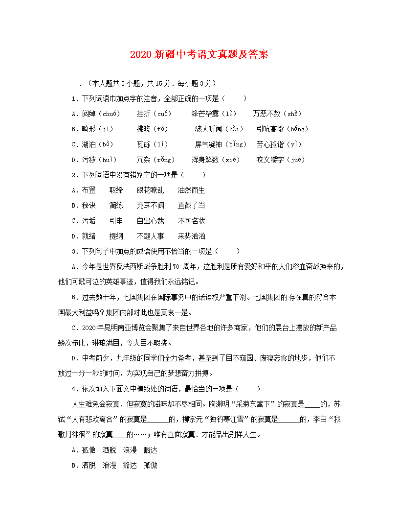 【文档名称】 2020新疆中考语文真题及答案(Word版).doc