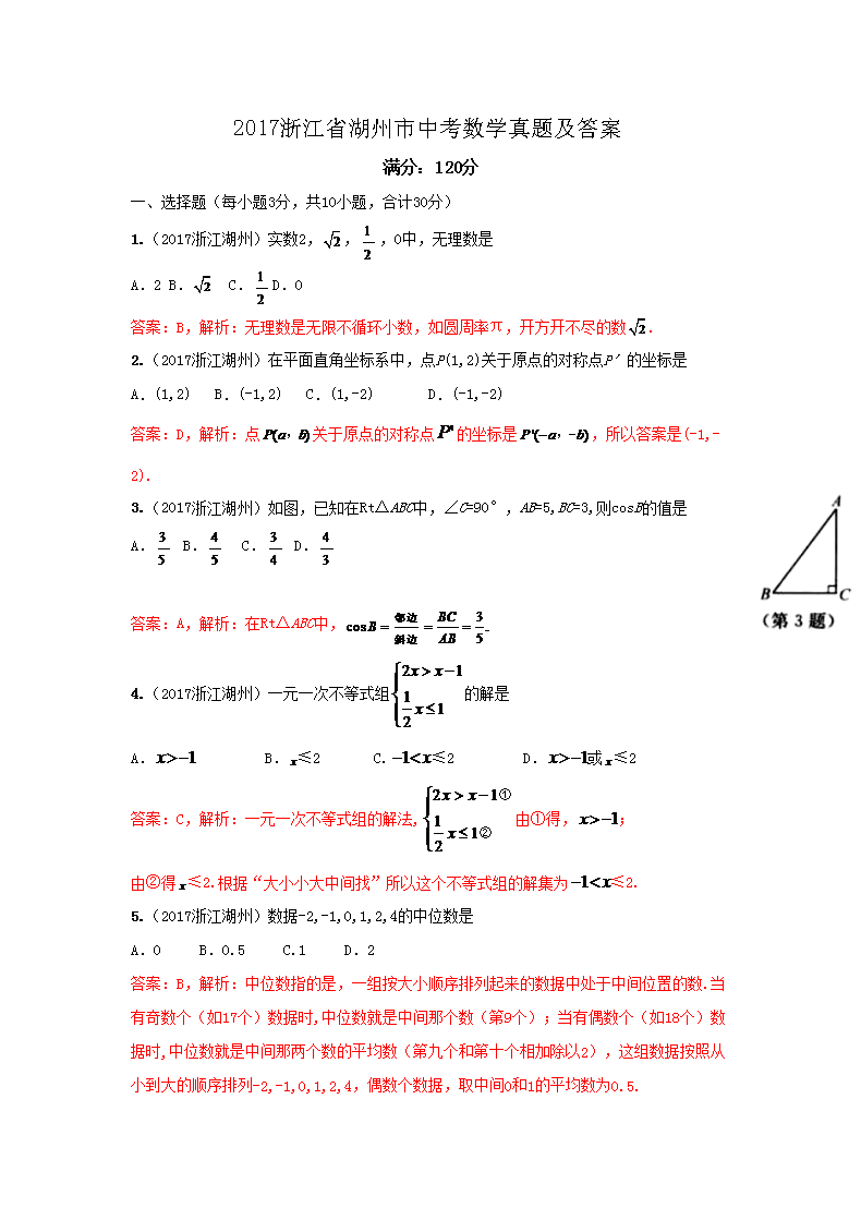 【文档名称】 2017浙江省湖州市中考数学真题及答案(Word版).doc