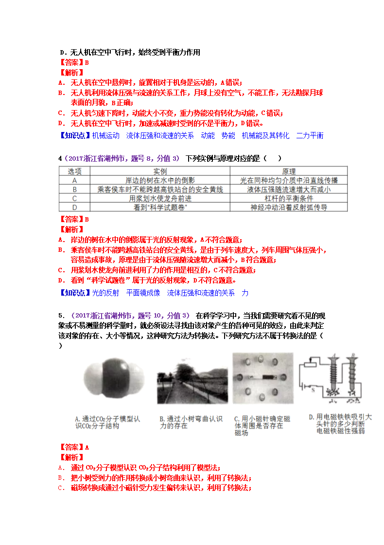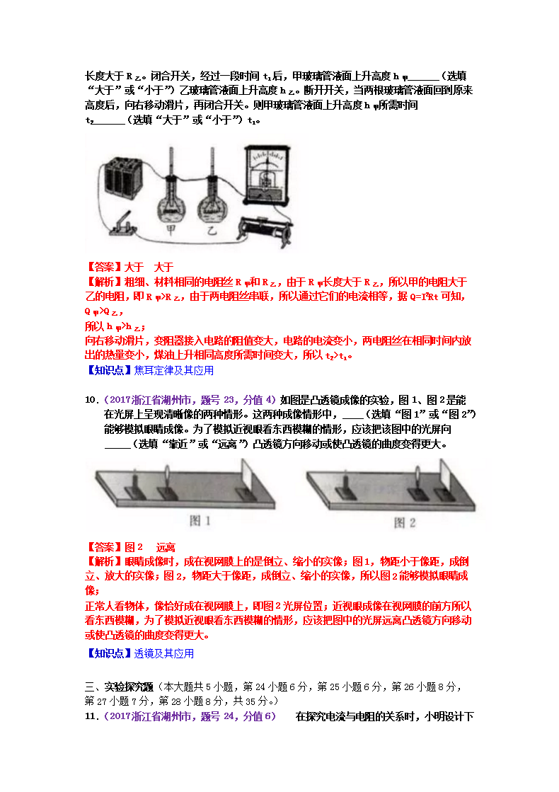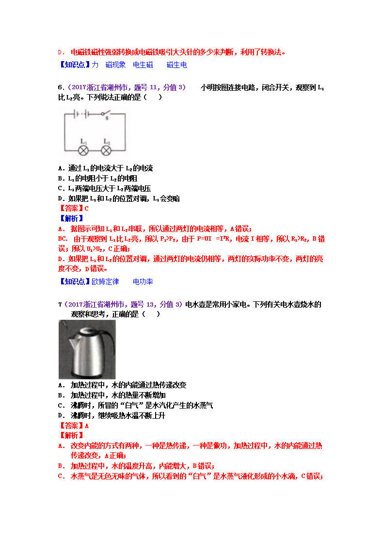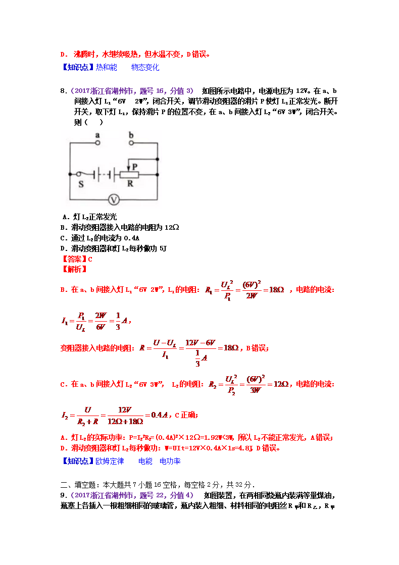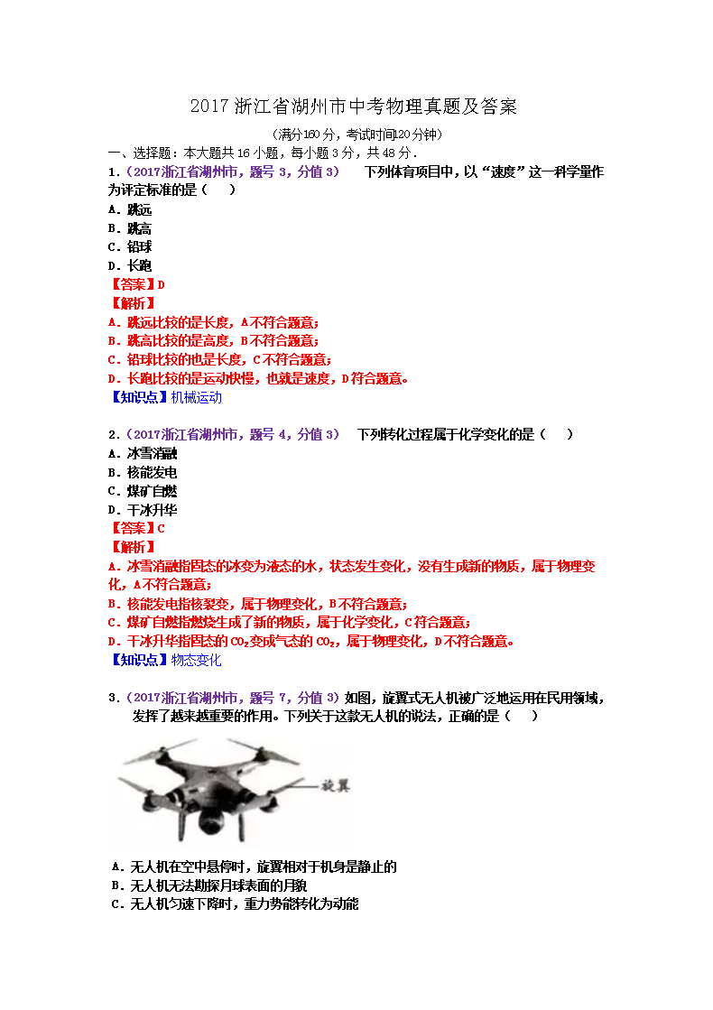 【文档名称】 2017浙江省湖州市中考物理真题及答案(Word版).doc