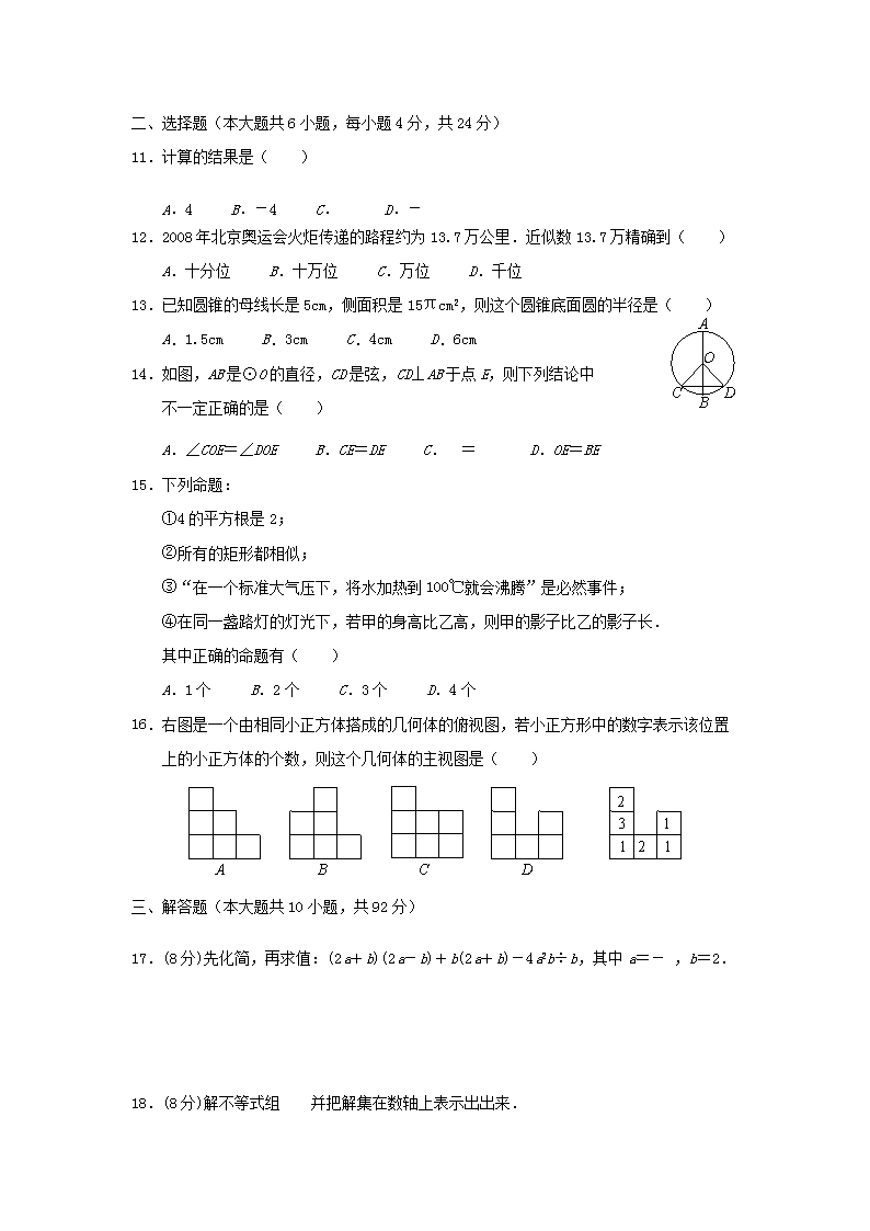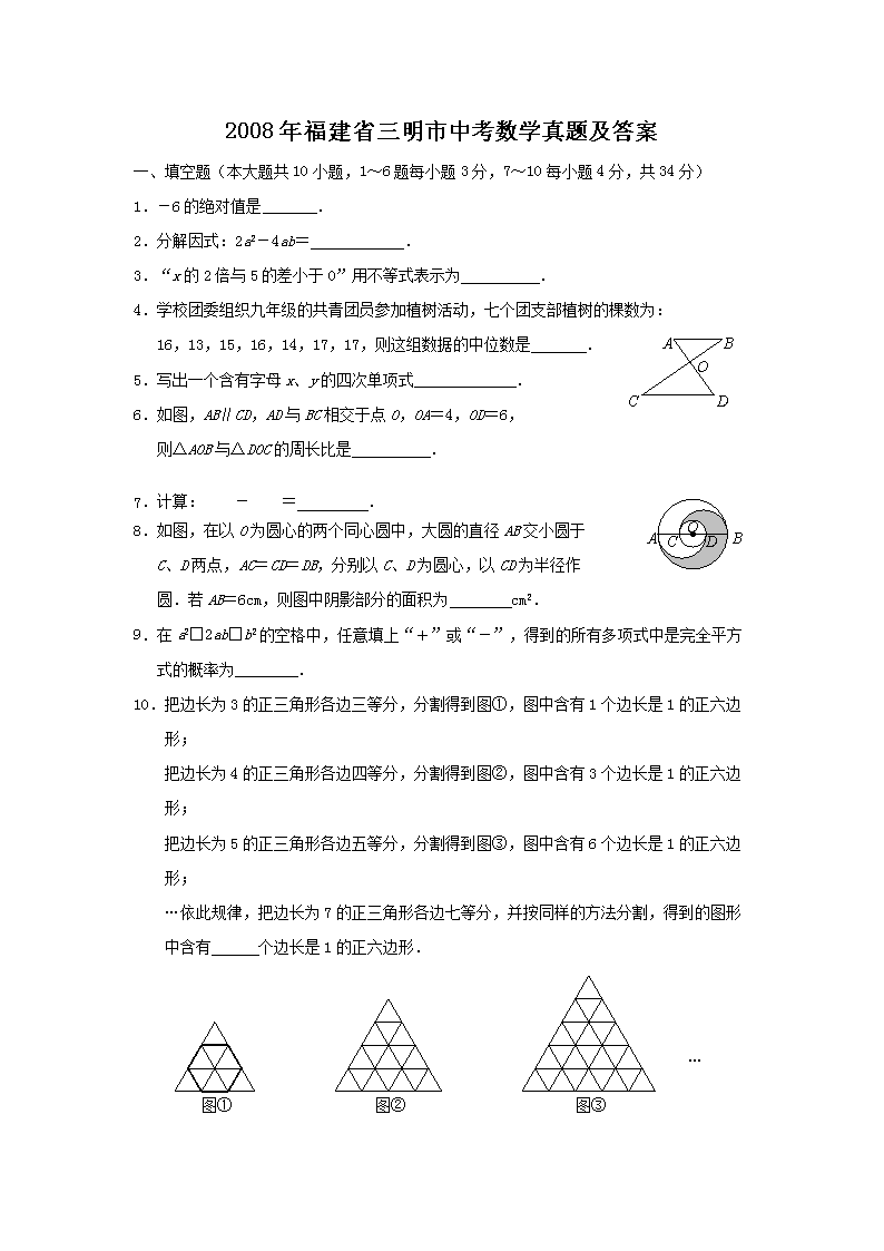 【文档名称】 2008年福建省三明市中考数学真题及答案(Word版).doc