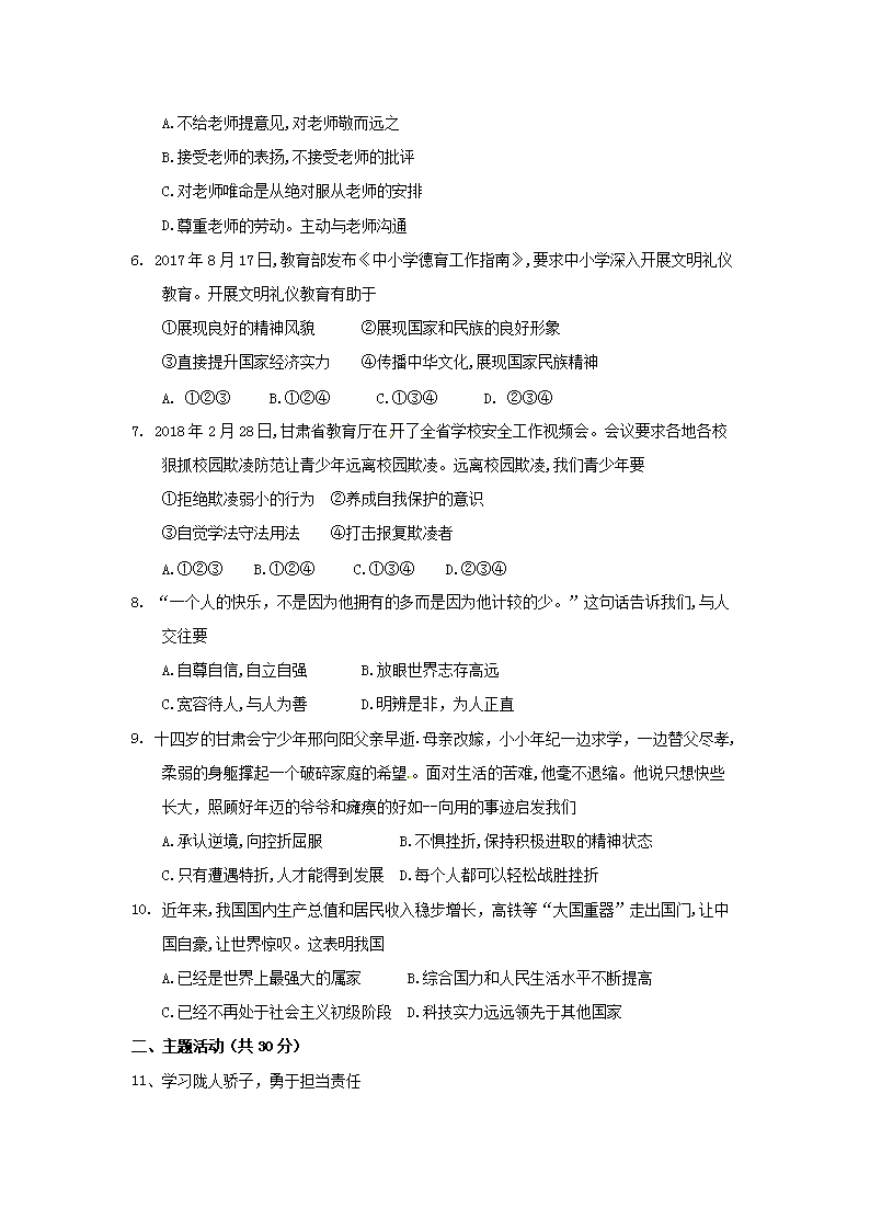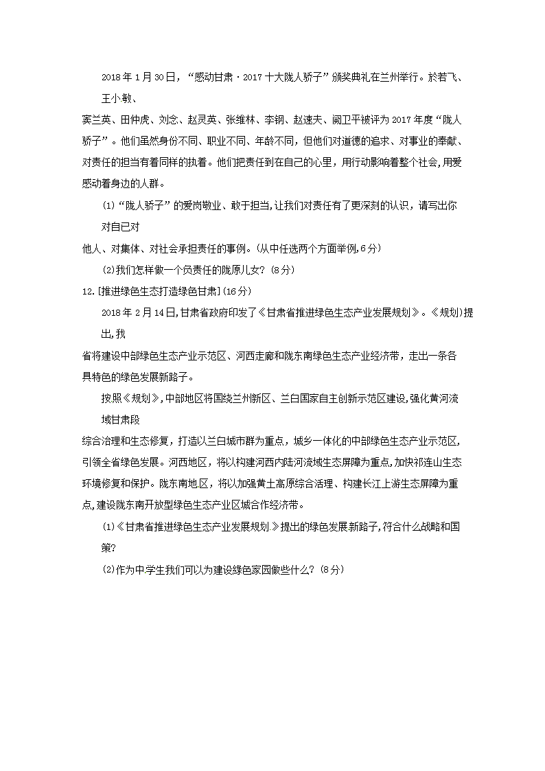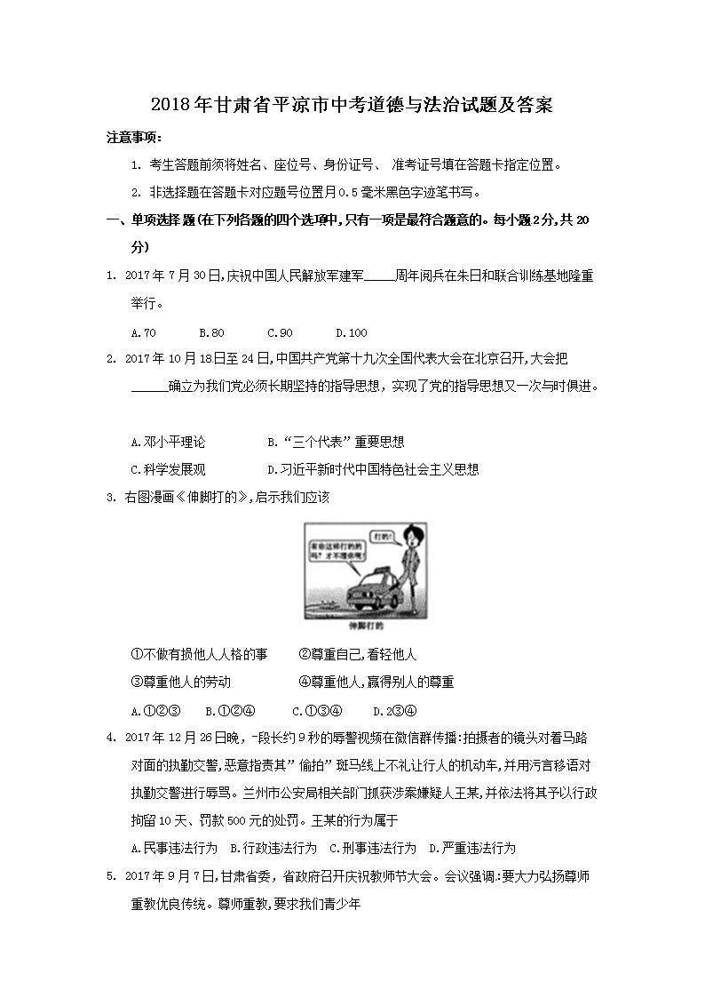 【文档名称】 2018年甘肃省平凉市中考道德与法治试题及答案(Word版).doc