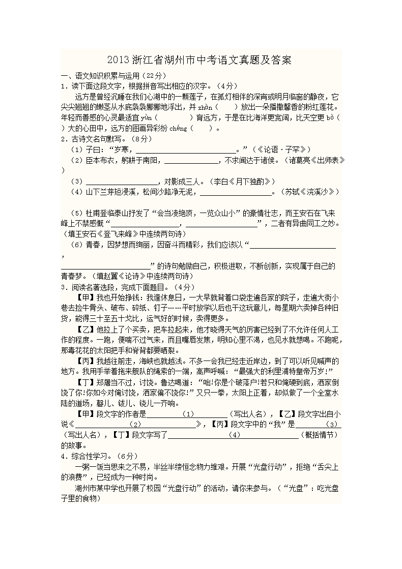 【文档名称】 2013浙江省湖州市中考语文真题及答案(Word版).doc