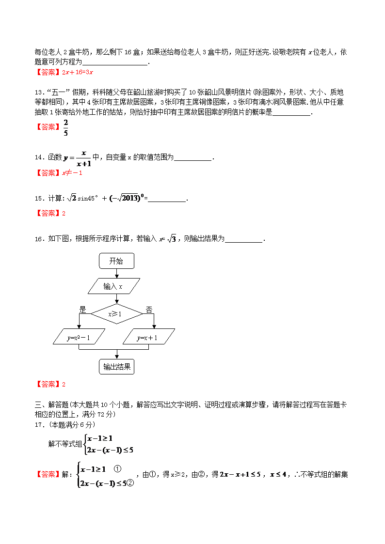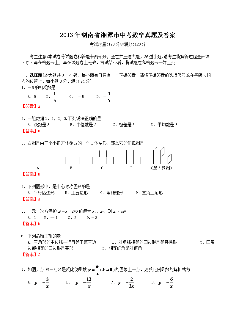 【文档名称】 2013年湖南省湘潭市中考数学真题及答案(Word版).doc