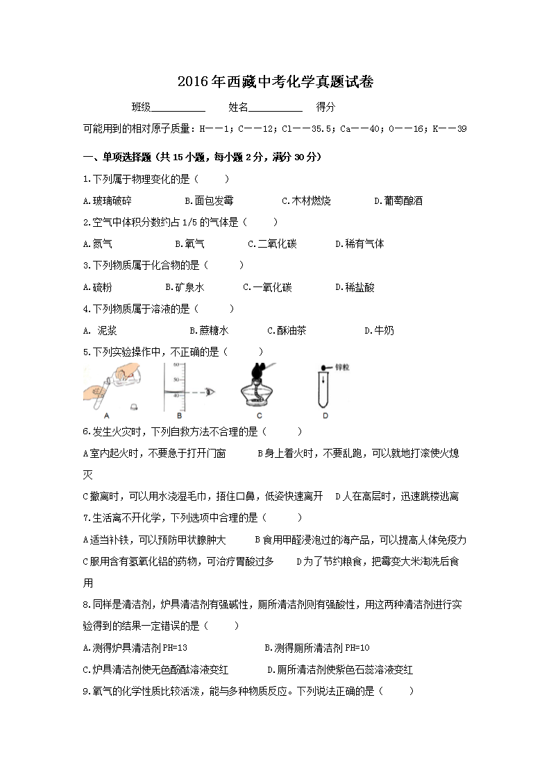 【文档名称】 2016年西藏中考化学真题试卷(Word版).doc