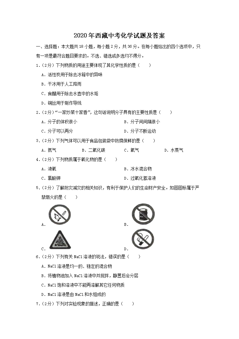 【文档预览】 无忧考网整理发布2020年西藏中考化学试题及答案(Word版),前五页预览如下: