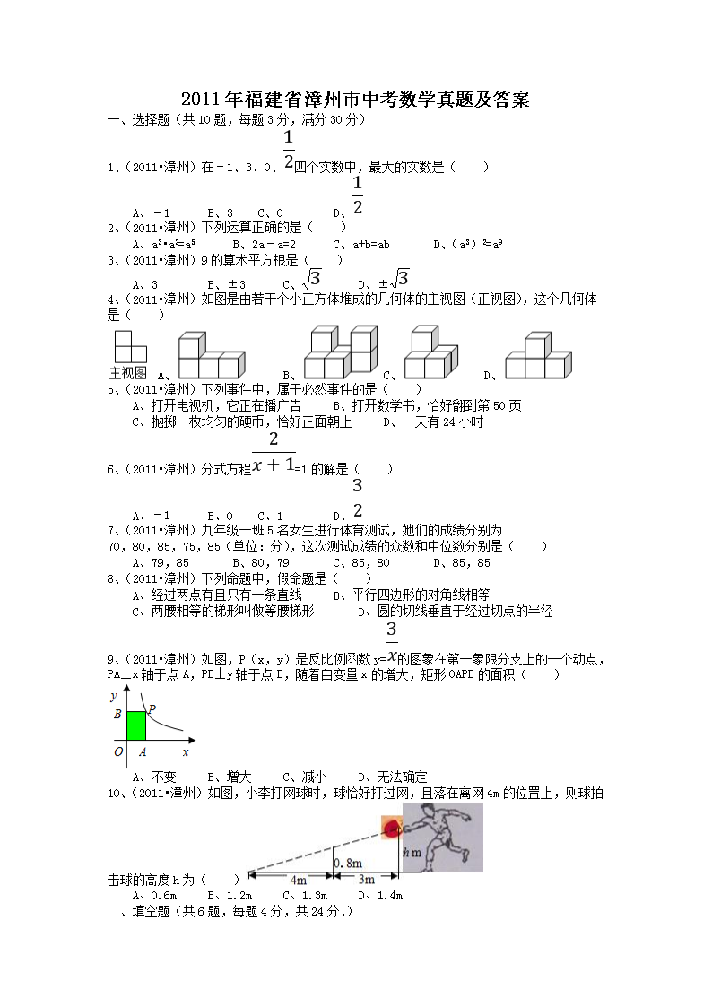 【文档名称】 2011年福建省漳州市中考数学真题及答案(Word版).doc