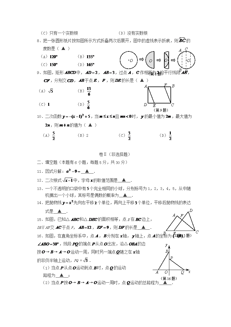 【文档名称】 2016浙江省嘉兴市中考数学真题及答案(Word版).doc