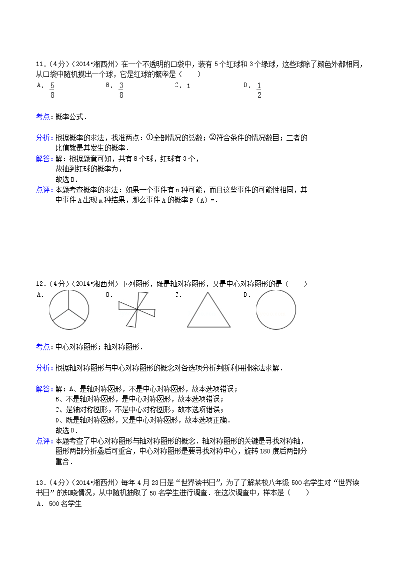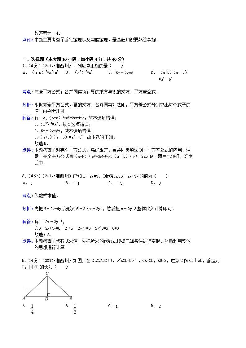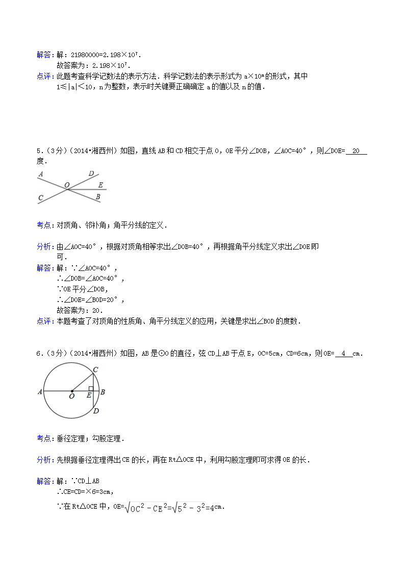 【文档名称】 2014年湖南省湘西州中考数学真题及答案(Word版).doc