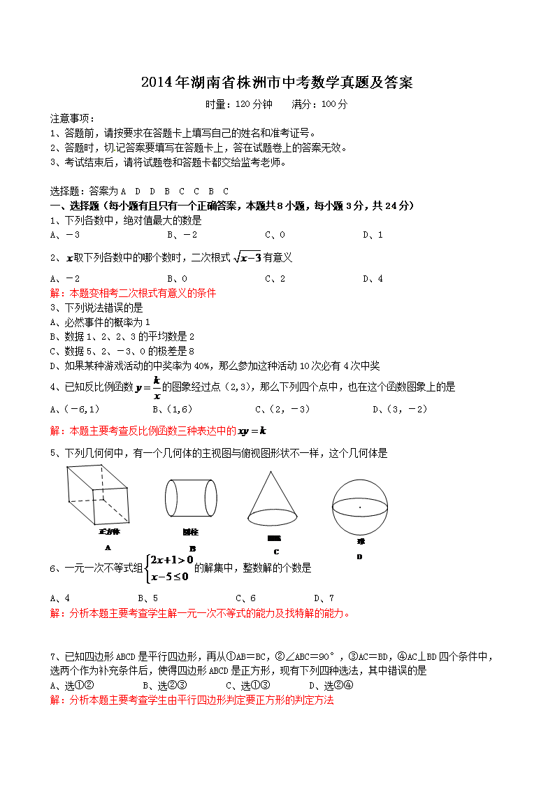 【文档名称】 2014年湖南省株洲市中考数学真题及答案(Word版).doc